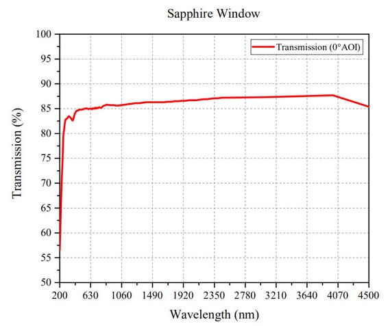 Sapphire material has high hardness (Moths 9), high melting point (2050℃) and good thermal stability, with wear resistance, corrosion resistance characteristics. And in the infrared spectrum, it has a high transmission rate, can be used in the wavelength range of  200 nm - 450 nm.